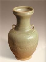 此瓶属常见器型,提醒矮胖,暗刻花卉纹饰。颈、肩处有双系对立,平底足,足心内凹,颈粗壮,缺盖。