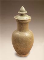 此瓶是比较典型的北宋中期龙泉窑产品。釉色青中带黄,瓶体布满暗刻花卉纹,丰肩,平底,底心略凹,瓶颈粗壮,几乎变成直口。瓶盖造工精细,刻有细致的莲瓣纹,盖钮如含苞待放的莲花。