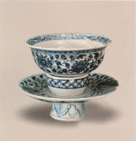盏为撇口,小圈足,足内底有乳状脐;托中间凸起为盏座,口微敛,托足较高,底部外撇,内无釉。盏、托满布纹饰,盏内口沿为卷草纹,内底为缠枝牡丹,盏外腹