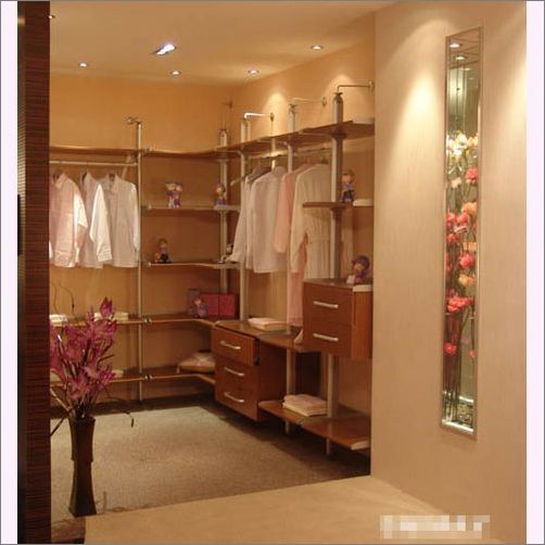 当换衣空间只占某个房间的一角时,它所起到的功能还要附加上对这个房间的装饰作用。由于房间注重统一的风格,因而换衣空间的家具选择必须符合整体的要求,还要尽量地留出一些空间来摆放些这个房间所需要的其它用品。
