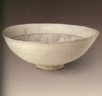碗撇口、浅腹、圈足。外壁光素无纹,碗内於釉上划刻花纹,刀法深刻有力,线条粗犷洒脱,表现了北方民间瓷窑质朴平实的装饰风格。
