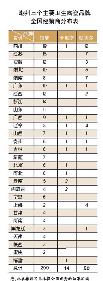 我们调查了潮州几个较大规模的卫生陶瓷品牌的全国经销商分布情况,包括恒洁、欧美尔、卡尼斯、法恩斯、梦佳等。在本报所掌握的全国9430个卫生陶瓷经销商中,经营潮州品牌的经销商只有269个,渠道占有率仅为2.85%。其中法恩斯80%以上产品外销,梦佳今年才计划做内销,在全国的经销商网点均不到五个。