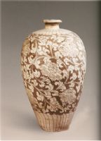 小口,短肩,丰肩,腹下收,平底。腹部饰剔花牡丹纹,肩部与腹下部刻菊瓣纹。花纹施白釉,其外露褐色胎。