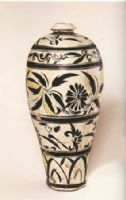 瓶小口,短颈,圆肩,上部丰满,腹下渐敛,宽圈足,俗称梅瓶。瓶身白地黑彩,上下共有四道弦纹,中间绘以花卉纹及变形焦叶纹,素底无釉。