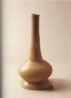 小口,细长颈,自上而下逐渐变粗,扁圆腹。矮圈足外撇,上饰有两道凹弦纹。釉色青黄间杂,质感不纯,整造型简洁流畅,为这一时期少见的佳品.