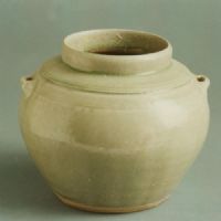 直口,圆唇,斜肩,圆球腹,平底内凹,肩部置对称二系并弦纹二道,釉不及底,少许开片.
