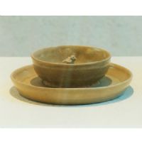 托盘平坦,直口圆唇,斜直壁,平底露胎,盘内置一弦纹碗,碗底中央塑一展翅欲飞的鸟,通体施青釉。