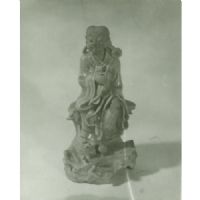 该像端座山石上,右手放膝,左手执一荷枝放右肩,宽衣薄袖,姿态悠然,为八仙传说中的何仙姑,釉色青,开片面部和山石不施釉.采用露胎的装饰手法,人物形象生动自然,栩栩如生.