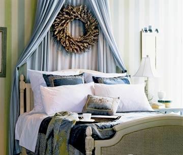 浅色的条纹墙纸、垂幔的床饰带出浪漫的风格, 蓝色的床头柜、白色的陶瓷台灯,清爽的色调搭配在一起,让卧室风格鲜明。