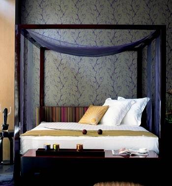 卧室中色调柔和的布艺床头庄重典雅而不乏轻松浪漫的感觉,与灰紫色暗花纹壁纸和深紫色的格纹地毯相互呼应,多层次的色彩变化,中和了深色家具带来的冷静,带有灰度的柔和色调让整个房间停留在雅致迷人的氛围里。