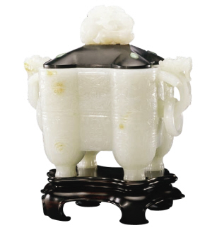 玉器部分的“清乾隆白玉兽耳活环仿古四足炉”是此类拍品的点睛之笔,玉质润洁,抛光精细,雕工细腻,端庄典雅,可称之为乾隆玉器的代表作品。