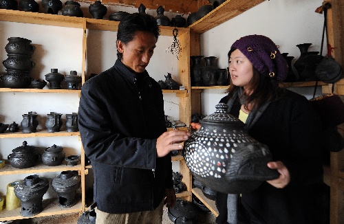 10月27日,尼西乡汤堆黑土陶手工艺人当珍批初(左)在自家店铺中向客人介绍黑土陶的特点。 近年来,云南省迪庆藏族自治州香格里拉县尼西乡利用良好的自然条件及特有的传统手工艺技术,积极发展生态鸡养殖与黑土陶烧制等特色产业,使“尼西鸡”和“尼西黑土陶”成为云南省的知名特色产品,让已参与其中的500多户农户每户每年增收超过万元,有效推动了当地一些藏族群众的脱贫致富。