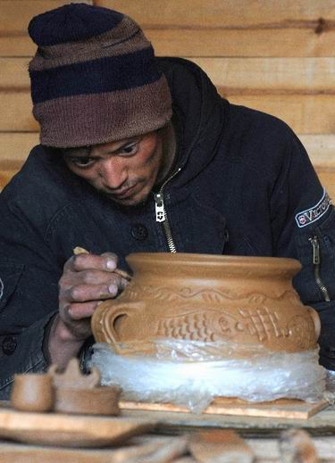 10月27日,尼西乡汤堆的一位手工艺人正在制作黑土陶器皿。 近年来,云南省迪庆藏族自治州香格里拉县尼西乡利用良好的自然条件及特有的传统手工艺技术,积极发展生态鸡养殖与黑土陶烧制等特色产业,使“尼西鸡”和“尼西黑土陶”成为云南省的知名特色产品,让已参与其中的500多户农户每户每年增收超过万元,有效推动了当地一些藏族群众的脱贫致富。