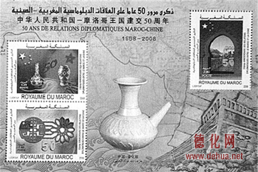 这套《中华人民共和国-摩洛哥王国建交50周年》丝绸镶瓷邮票小全张,由我省邮电印刷厂印制,是世界上第一套将丝绸和瓷器两种元素结合起来的外交邮票。邮票选用福建德化白瓷、苏州丝绸、安徽劲县宣纸为材料。据外交部集邮协会秘书长马小玲介绍,特别选取福建德化白瓷作镶嵌瓷器是因为600年前摩洛哥王国旅行家伊本白图泰曾到过福建泉州。