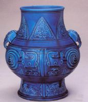 尊口微撇,短颈,溜肩,硕腹,高圈足外撇,器口与足大小相若,肩部两侧各置一象耳,通体及足内施孔雀绿釉,外壁有仿古铜器上的夔纹。