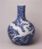 瓶直口,长颈,球形腹,圈足。通体绘青花海水地刻划白龙纹,近足处绘海水江崖,口沿辅以忍冬纹边饰。