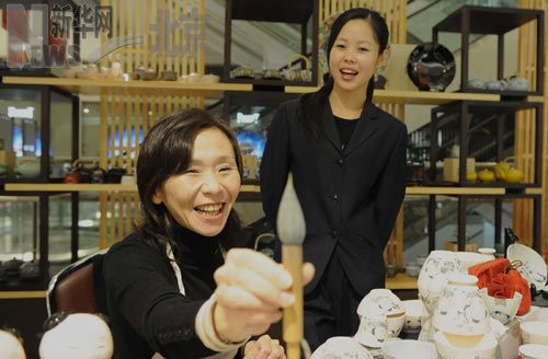 11月7日,日本西海陶器集团高级画师近藤朱美(左、KONDO AKEMI)在北京新光天地商厦为中国宾客现场表演陶瓷绘画技艺。11月6日至8日,日本陶瓷工艺和陶瓷文化展示表演活动在北京举行,此次活动主办方长崎西海陶器集团成立于1946年,是日本瓷都肥前地区的代表性公司,以精巧细致的“有田烧”“波佐见烧”等日本传统瓷器著名。日本的陶瓷文化来源于中国,在融入日本文化风俗后,其陶瓷工艺别具一格,目前日本陶瓷产业拥有较强的科技开发能力和大批名牌产品。2007年,西海陶器集团进入中国市场,开始将日本优秀陶瓷产品介绍给中国消费者。