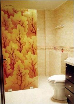 如果你的卫生间没有放置浴缸的空间,而你又不喜欢淋浴房,那么使用这样一款色彩饱和度高的艺术玻璃作为沐浴区的隔断的确是个聪明的选择,金黄色的树叶与墙体、地面的颜色相互辉映,增加了卫生间温暖的感觉。