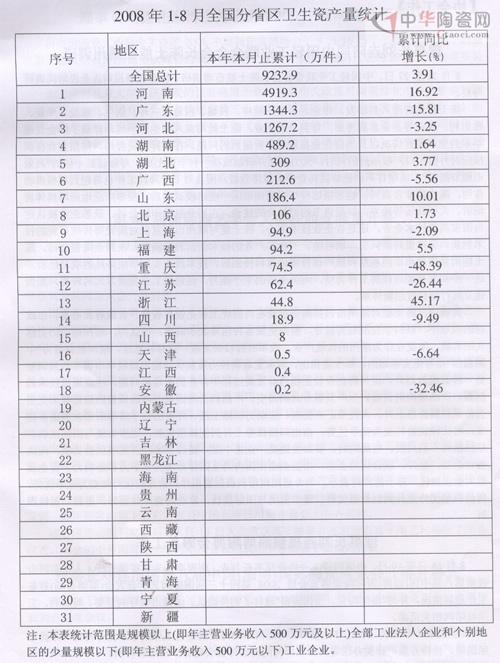 2008年1-8月全国分省区卫生瓷产量统计