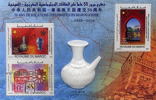 据悉,特别选取福建德化白瓷镶嵌在小全张上是因为摩洛哥王国旅行家伊本·白图泰曾到过福建泉州。这也是世界上首枚丝绸镶瓷邮票。(《中国集邮报》2008年11月4日第一版)