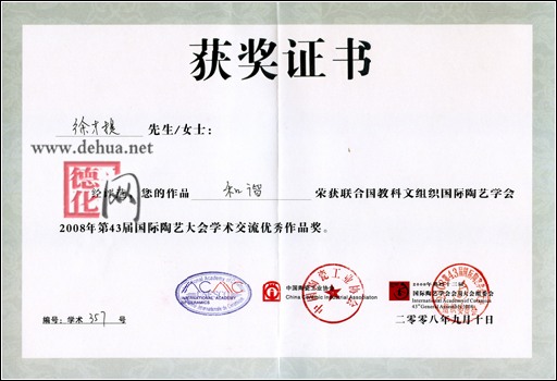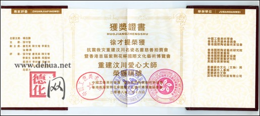 徐才提荣获中国工艺美术学会、香港国际陶瓷艺术家协会举办的《抗震救灾重建汶川名瓷名画慈善拍卖会暨香港首届紫荆花杯国际文化艺术博览会》重建汶川爱心大师称号