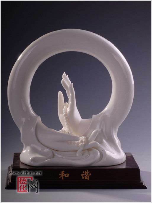中国瓷都·德化陶瓷艺术大师徐才提以巧妙的构思、精湛的技艺精心创作了《和谐》“中国白”瓷雕,以陶瓷雕塑的艺术形式阐释了“和谐”的深刻涵义。