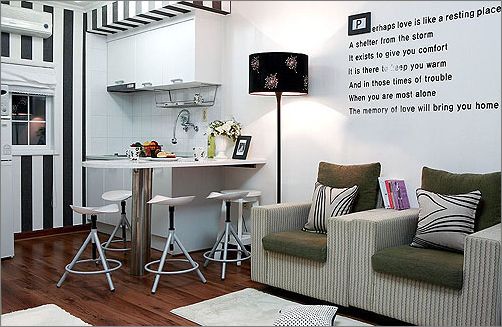 厨房空间 无论是黑色的落地灯,还是厨房墙壁上的黑白线条,或是白色的餐桌和椅子,都使这个房间显得无比优雅端庄。