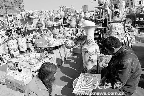 20日,记者在南昌市青山路举行的陶瓷展销会上看到,展会上生意冷清,顾客稀少。商家在一旁晒太阳,有的甚至在玩牌。来自抚州的经销商李泽民抱怨说,10天来,没卖出两件瓷器,夫妻俩加上住房吃饭每天40元开销,连本钱都赚不回来。