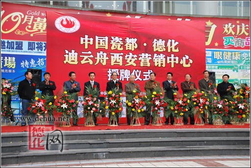 中国瓷都·德化——迪云州陶瓷西安营销中心在陕西省省会的设立,旨在通过这里构架德化面向国内外的经济、商贸、文化交流合作桥梁,并借助这里良好的区位优势和人文优势进一步拓展国内外市场,让德化陶瓷通过西安为广大国内外人士认识、认知,消费购买。营销中心包括了当代德化瓷艺术的品种和流派,熔现代艺术和现代科技于一体,既有工艺瓷、高档艺术瓷雕,又有日用瓷,汇集了瓷都德化20多位工艺美术大师和企业的工艺、日用两大类陶瓷系列数千件作品、产品,可谓异彩纷呈,百花争妍艺术,是收藏、鉴赏、礼品馈赠的首选。