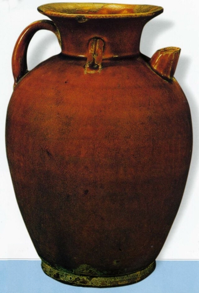 此件的黄釉注子就是寿州窑出产的,它是圆腹型注子,整个造型简洁流畅,釉面均匀光滑,体现了寿州窑黄釉瓷器的特点。
