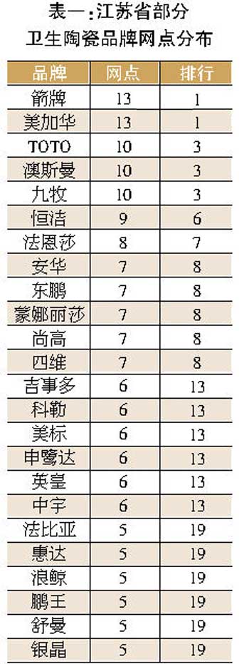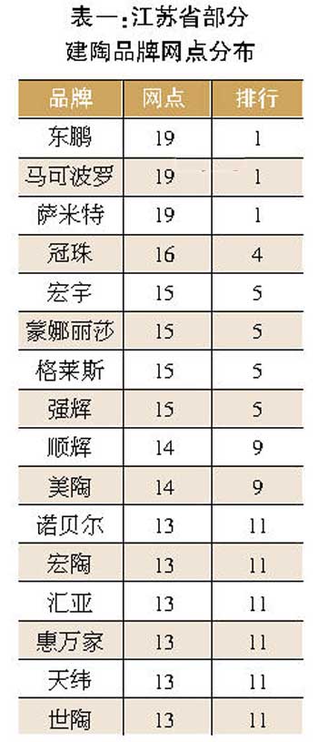 在江苏二、三级市场的建陶品牌中,东鹏、马可波罗、萨米特以名副其实的行业地位并排各品牌网点之首(见表一),冠珠、宏宇、蒙娜丽莎也不甘落后,紧随其后。