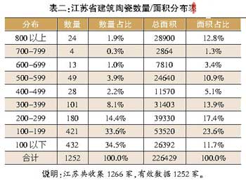 在参与调查的1252家建陶店中(见表二),拥有200平方米以上店面的有399家,数量占比32%,主要分布在南通、常州、苏州、扬州、无锡。