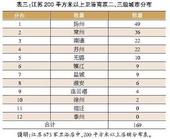 从区域分布来看(见表三),扬州以绝对优势占据江苏二、三级市场的主导地位,仅200平方米以上经营面积就达49家。在网点排名前20名的卫浴品牌中(见表一),科勒、TOTO、美标等国际品牌都有出现,而箭牌、美加华仍超过国际品牌,而位居第一。从数据可以看出,江苏的二、三级市场被国际品牌所看好,网点的建设力度也相对其它地级市场要强。而在国内品牌中,福建的品牌布点相比有所加强,九牧、申鹭达、中宇等品牌在江苏市场的开拓力度有目共睹。