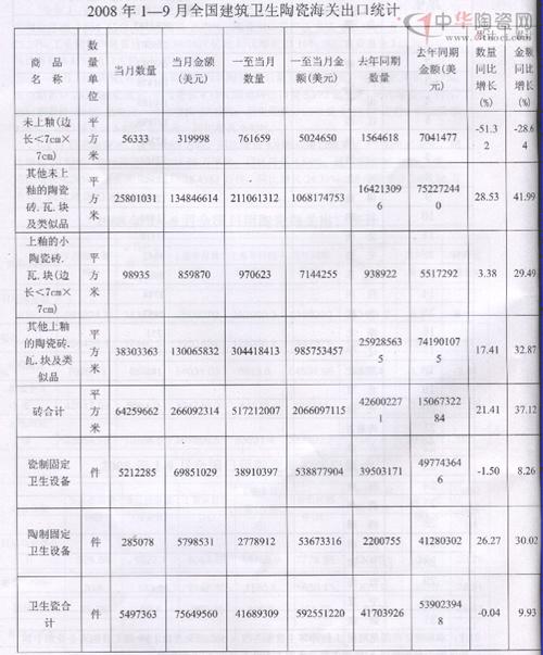 2008年1-9月全国建筑卫生陶瓷海关出口统计