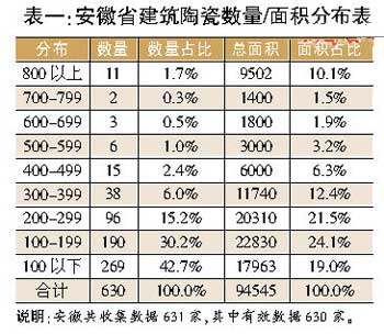 安庆共有陶瓷卫浴商户150家左右,芜湖陶瓷商户60多家,而马鞍山的陶瓷卫浴商户也超过100家。从参与本报调查的630家陶瓷店数据分析表明(详见表一),无论是数量还是面积,100-200平方米陶瓷店都占主导地位。而从区域分布来看,16个地级市中,安庆、芜湖、淮南、铜陵、马鞍山等地级市200平方米以上陶瓷店居多(详见表三)。