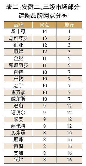 记者走访了解到,在安徽16个地级市中,除了毫州,都有建材市场,新中源、马可波罗等知名品牌几乎都有分布。新中源以14个网点的数量分布于安庆、蚌埠、淮北、黄山等地级市,网点建设真实体现了品牌实力,而马可波罗、汇亚、顺辉则竞相赶追。而且,在排名前十名的建陶品牌中,清一色是佛山的品牌(详见表二)。