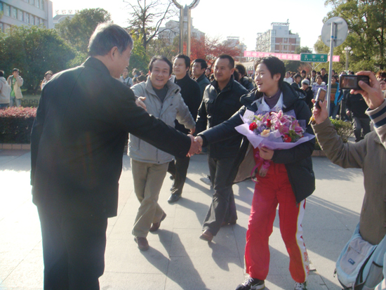 景德镇在线讯:12月5日下午,北京奥运会女子49公斤级跆拳道冠军吴静钰和家人、教练,景德镇市体育局领导一行来陶瓷学院参观,受到了学校党委书记肖任贤等校领导和数百名师生的热烈欢迎。学生代表向吴静钰敬献了鲜花,并一致表示“向奥运冠军致敬,向奥运冠军学习”。