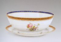碗敞口,口沿蓝彩上有描金纹饰。碗外壁绘红玫瑰,配以兰、黄色小花和绿色枝叶,边有瑞典文“安娜”。