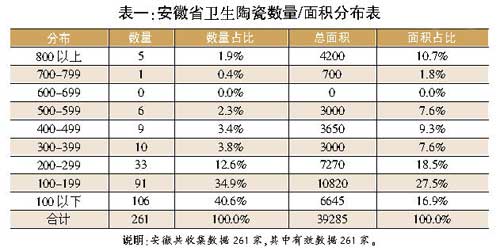 在安徽地级市场中,恒洁、惠达、吉事达、英皇、申鹭达等卫生洁具品牌都有网络,虽然网点不多,但品牌影响力在这些地级市场中仍不可小视。在调查的261家卫生陶瓷店中,100-200平方米经营面积数量占比近50%(详见表一),成为地级陶瓷店的主流,马鞍山、安庆、蚌埠、黄山等地的卫生陶瓷店面积普遍较大,其中,就200平方米以上经营面积看(详见表二),安庆仍居首位,黄山尾随其后。而滁州、池州的卫生陶瓷店与建陶店一样,仍多以较小面积为主。