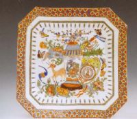 盘心采用博古图案装饰,用一些表示种种美好的希望象征物,如寿字、铜钱、鹿、蝙蝠、蝴蝶等等构成画面。盘沿部分以织锦纹用为装饰图案,在其装饰的徽章纹里有句拉丁格言:“Fortiter et Celeriter”(译:处事坚强,待人温和)。盘的底部则用红彩书“Alice och James Keiller Canton1913”以及Chinese Min Guo Nian Bao Xing Zao(音译:中华民国年宝兴造)和汉字“民国年宝兴造”六字款。