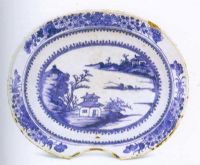 器物呈椭圆,口沿有半圆缺口,装饰三组卷草花卉图案,中心图案为青花山水。此盆为男性刮胡须所用。