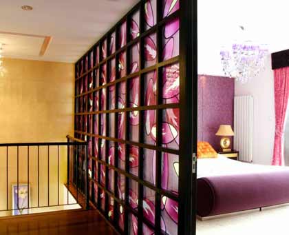 案例中,楼梯间与卧室相邻,因为楼梯间没有窗户,因此采光受到了很大影响。将原有的卧室墙面改造成一面玻璃隔断,这个问题便迎刃而解了。紫色花纹的玻璃隔断不仅与卧室主色调相一致,并且将卧室窗外的光线“引进”到了楼梯间,让此处的采光效果得到了极大改善。