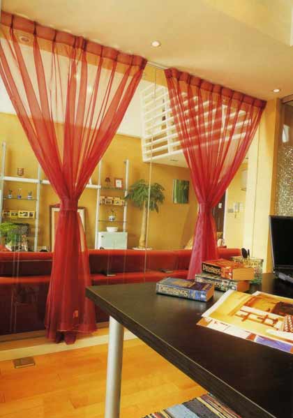 想要在客厅里分割出书房空间,使用玻璃墙是最好的办法。玻璃墙不仅有良好的隔音效果,保证了书房空间的安静,它还最大限度地保障了书房空间的采光效果不受影响。如果想要为书房增添一些私秘感,则可以在玻璃墙外悬挂一幅半透明的纱帘,它既实用,又能为居室增添美感。