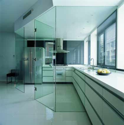 开放式厨房近年来受到不少人的青睐,但是中国人的烹饪方式容易使厨房里的油烟扩散到其他空间。采用玻璃墙对开放式厨房和其他空间进行分隔是解决这一问题的好方法。透明的玻璃墙很好地保证了开放式厨房的开阔感和透亮性,在视觉效果上不打折扣,而烹饪时的油烟扩散问题也能因此得以解决。