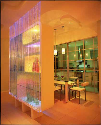 展示架也非常适合用来划分客厅和餐厅空间。在这个案例中,充满时尚、动感造型的展示架不着痕迹地发挥着自己的分隔作用,同时,又能与被分开的两个空间完美融合,不显突兀。为了增强装饰效果,带有发光效果的线帘也被运用了进来,让这处空间充满了设计感,显得新颖而独特。