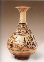 瓶撇口,细长颈,溜肩,圆腹,圈足,足内砂底无釉,俗称[玉壶春瓶]。通体以白地黑花为饰。肩部绘卷草纹和卷草花纹各一周。腹部绘折枝菊花两组。此瓶造型优美,线条流畅,纹饰活泼,是磁州窑的精美作品。
