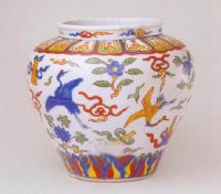 罐直口,短颈,丰肩,瘦底,内圈足。罐通体以青花加红、绿、黄三色彩绘。腹部绘仙鹤彩云,三为青鹤