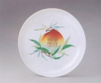 盘敞口,弧壁,圈足。盘心绘一折枝桃,枝干用赭色,叶用翠绿和草绿,桃用红,黄,绿彩,叶脉用黑彩,桃中心金彩篆书“万”,“寿”二字。