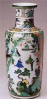 瓶洗口,直颈,斜肩,瓶身直如截筒,圈足。颈部中间留白一圈将纹饰分为上下两层,分别为朵花地和锦地两面开光纹饰,开光相错而置,其中分别画花蝶小景,山水人物,渔舟垂钓。