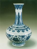 胎质洁白。撇口,长颈,圆腹,圈足。身绘青花纹九组,口沿绘海浪纹、如意头纹;颈绘蕉叶纹;眉部分别为回纹、缠枝莲纹、如意头纹;腹部绘缠枝莲纹;下脚绘莲瓣纹、卷草纹。青花颜色鲜艳,白釉莹润,底部双圆圈内写“大清雍正年制”六字青花楷书款。